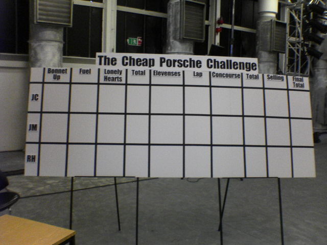 I went with Alan B. and M5 Tim to see the filming of Sundays Top Gear which includes 'The Cheap Porsche Challenge'. (We also spotted Rob, Simon, Bill, Paul Anderson and other 928'ers there) They were miffed about the spelling of 'concours' and fixed it quickly